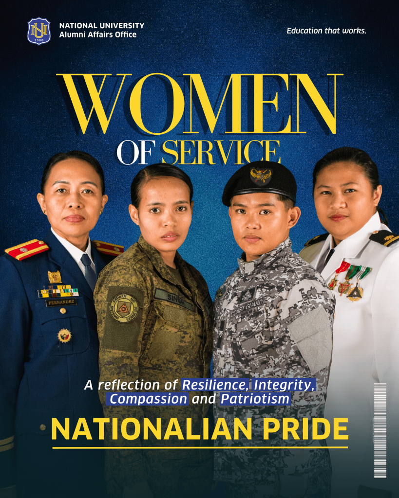 Women of Service—Four (4) NU Alumnae, Ret. PLTCOL Cynthia Faigao-Fernandez, DMD; PVT Clrifer D. Singh; Coast Guard Seawoman Baby Elvie Gueqillo; and ENS Ria Joy J. Nabalan O-22400 PN, reflect on how the NU core values (Resilience, Integrity, Compassion, and Patriotism) impact their dedication to public service and national security.
