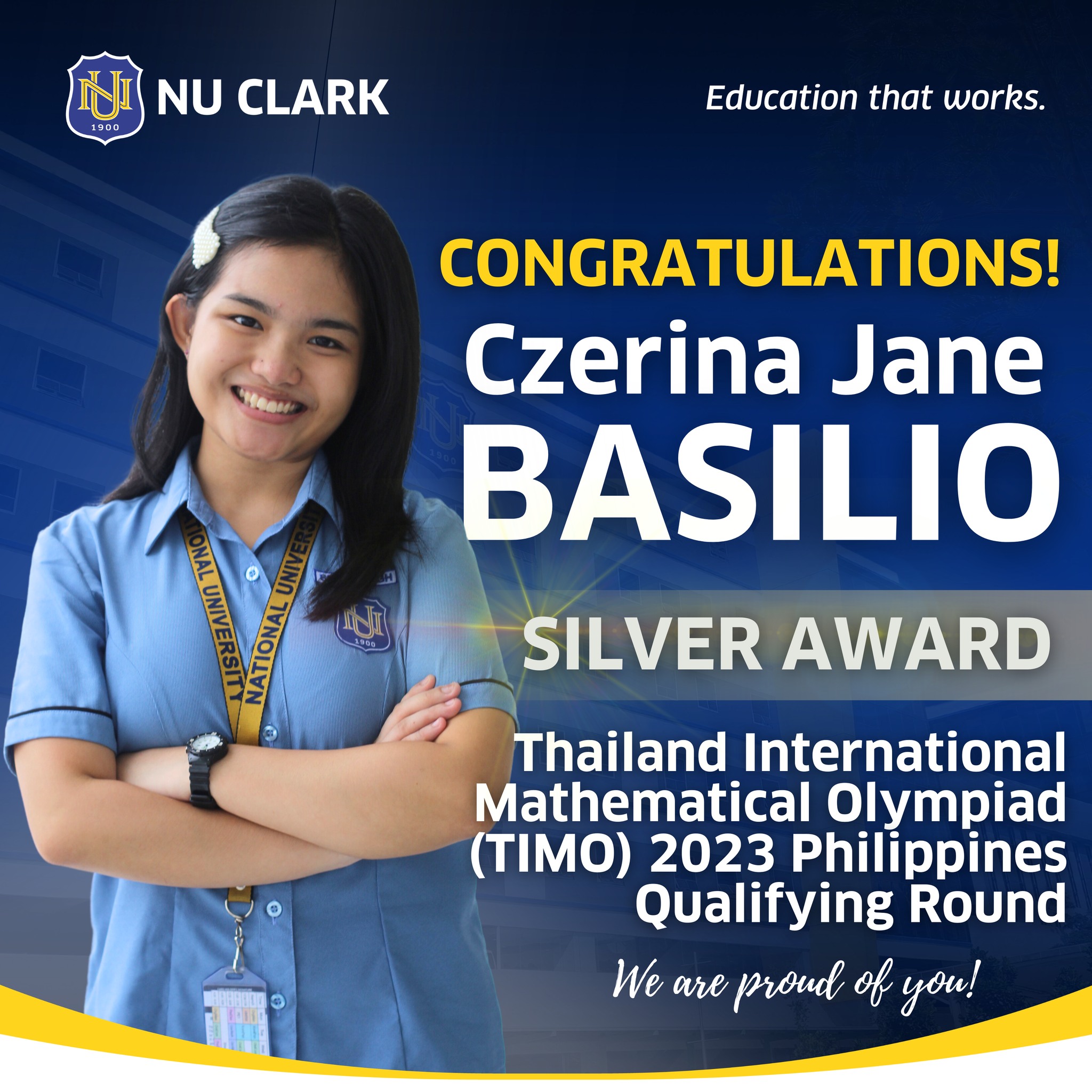 NU Clark Senior High School Department bags a milestone at the Thailand International Mathematical Olympiad 2023 Heat Round (TIMO) on November 1, 2023. Czerina Jane Basilio, an ABM SHS student from NU Clark who is also the Secretary of the Senior High School Student Government of the university received a Silver Award for the said event. Basilio will have a chance to to be a part of the Philippine Delegation to one of the most prestigious math competition in the world – TIMO 2024 FINAL ROUND