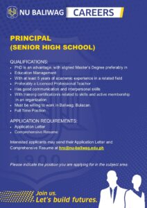 NU BALIWAG is urgently looking for a Senior High School Principal for Academic Year 2021-2022. QUALIFICATIONS:1. Ph.D. is an advantage, with aligned Master’s Degree preferably in Education Management2. With at least 5 years of academic experience in a related field3. Preferably a Licensed Professional Teacher4. Has good communication and interpersonal skills5. With training certification/s related to skills and active membership in an organization6. Must be willing to work in Baliwag, Bulacan.7. Full-Time Position APPLICATION REQUIREMENTS:1. Application Letter2. Curriculum Vitae3. Transcript […]