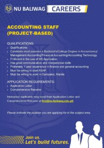 Join Us! NU Baliwag is looking for the following Teaching and Non-Teaching positions for 2nd Term, AY 2021-2022: -Accountancy Faculty Member (Full Time) -NSTP Faculty Member (Full Time) -Lawyer – BSBA Faculty Member (Part-Time) -Guidance Counselor Interested and qualified applicants may send their application requirements at [email protected] Please indicate the position you are applying for in the subject area.
