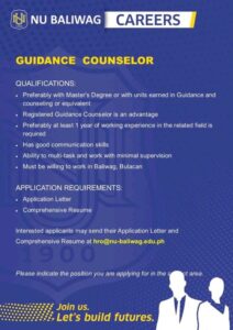 NU Baliwag is looking for a GUIDANCE COUNSELOR. Interested applicants may e-mail their application requirements to [email protected] Thank you!