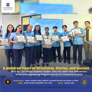 A century of shaping the builders of progress! The PICE-NU East Ortigas Student Chapter officers, together with Engr. Gabriel Galvez proudly took part in the 100th Year Anniversary of the Civil Engineering Program and CE Centennial Summit at NU Fairview. The summit celebrated the incredible journey of Civil Engineering – its milestones, innovators, and its impact on building a stronger, more resilient nation : PICE – NU East Ortigas Student Chapter #NUEastOrtigas #RiseWithUs #EducationThatWorks #PICE #CivilEngineering