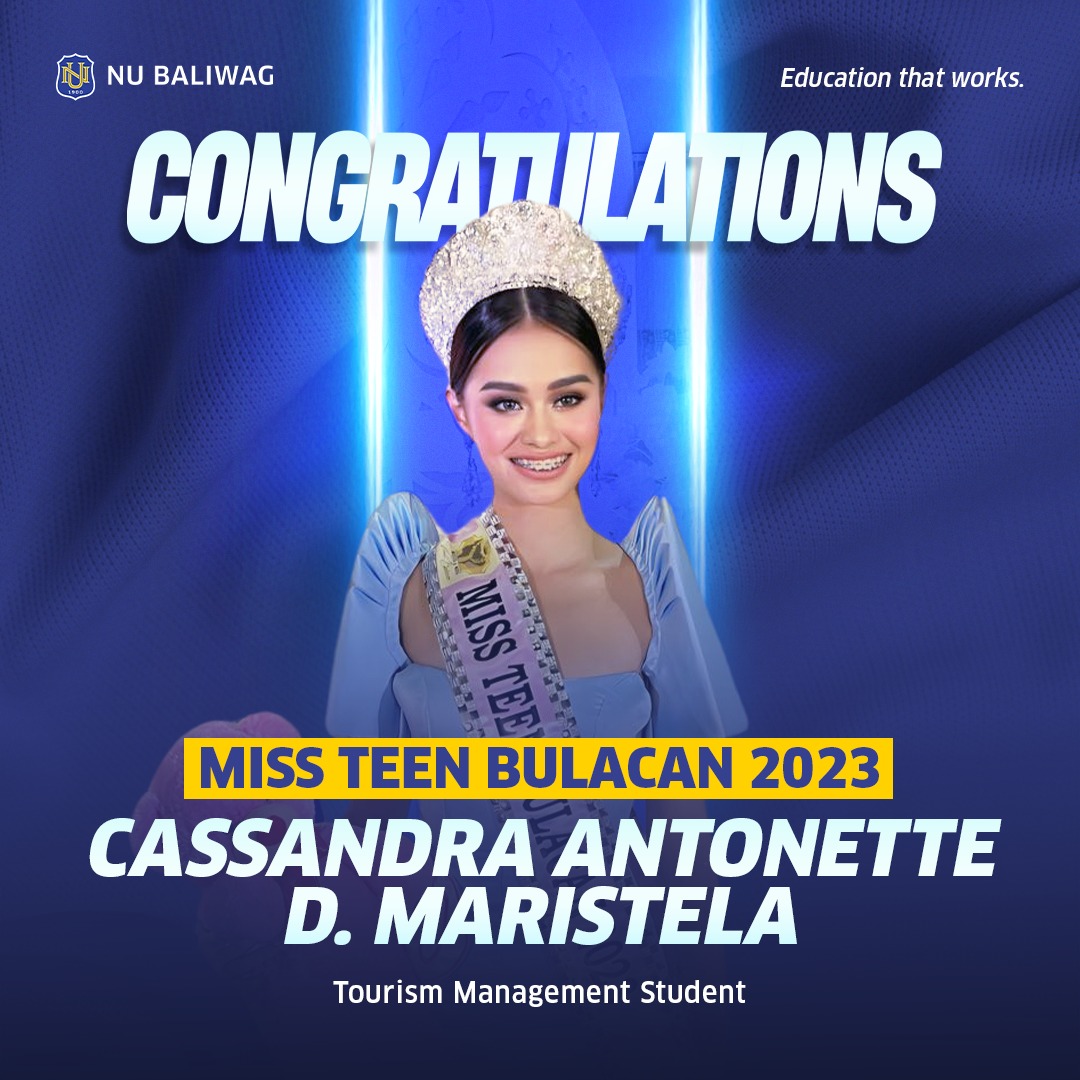 In the radiant tapestry of academia and beauty pageantry, Ms. Cassandra Antonette D. Maristela shines brightly. A distinguished student in the Tourism Management program at NU Baliwag, she has recently achieved a milestone by earning the coveted title of Miss Teen Bulacan 2023.