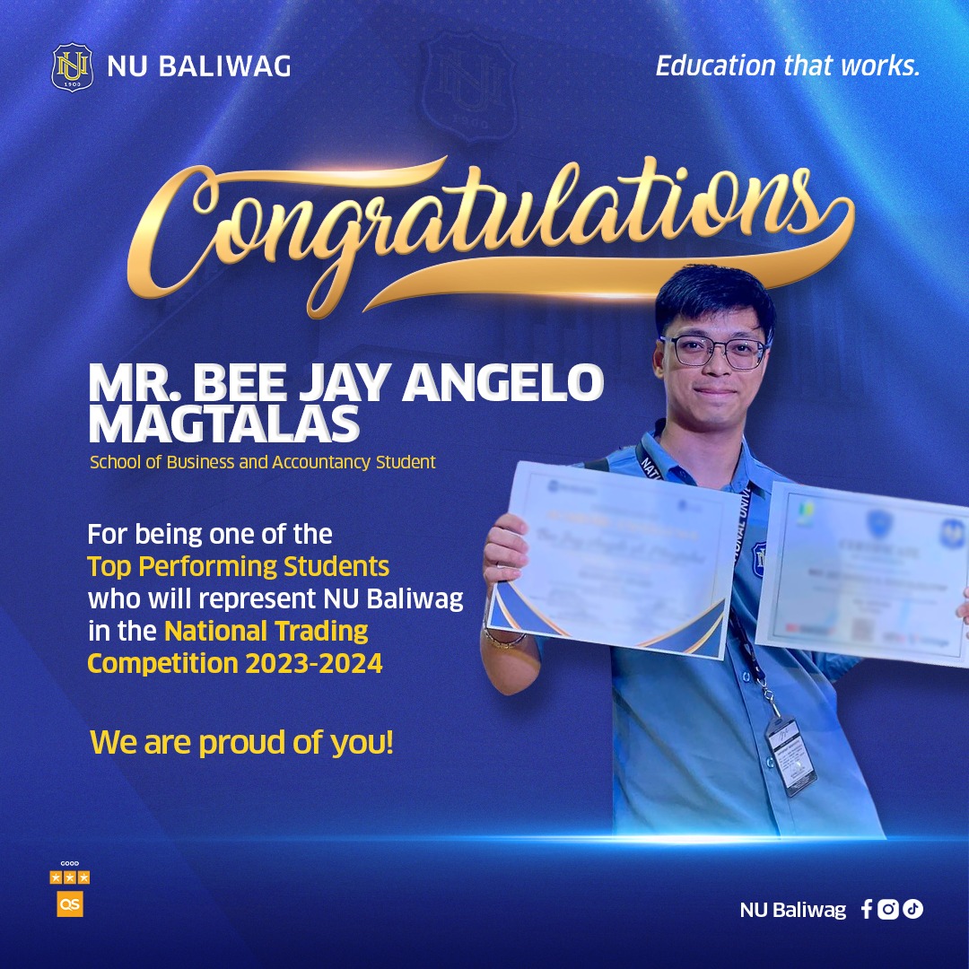 We eagerly anticipate Mr. Magtalas’ representation of NU Baliwag in the National Trading Competition, confident that he will exemplify the excellence and determination that define the School of Business and Accountancy. The university stands proudly behind him, wishing him the best of success in this exciting venture.