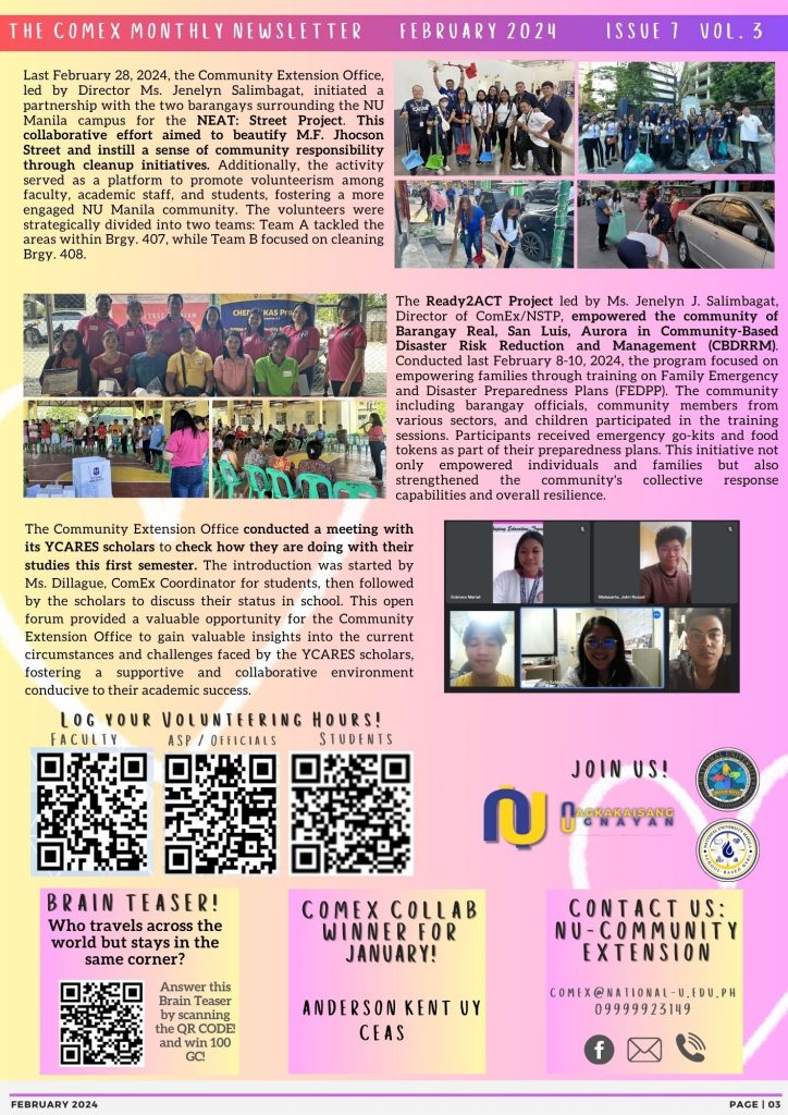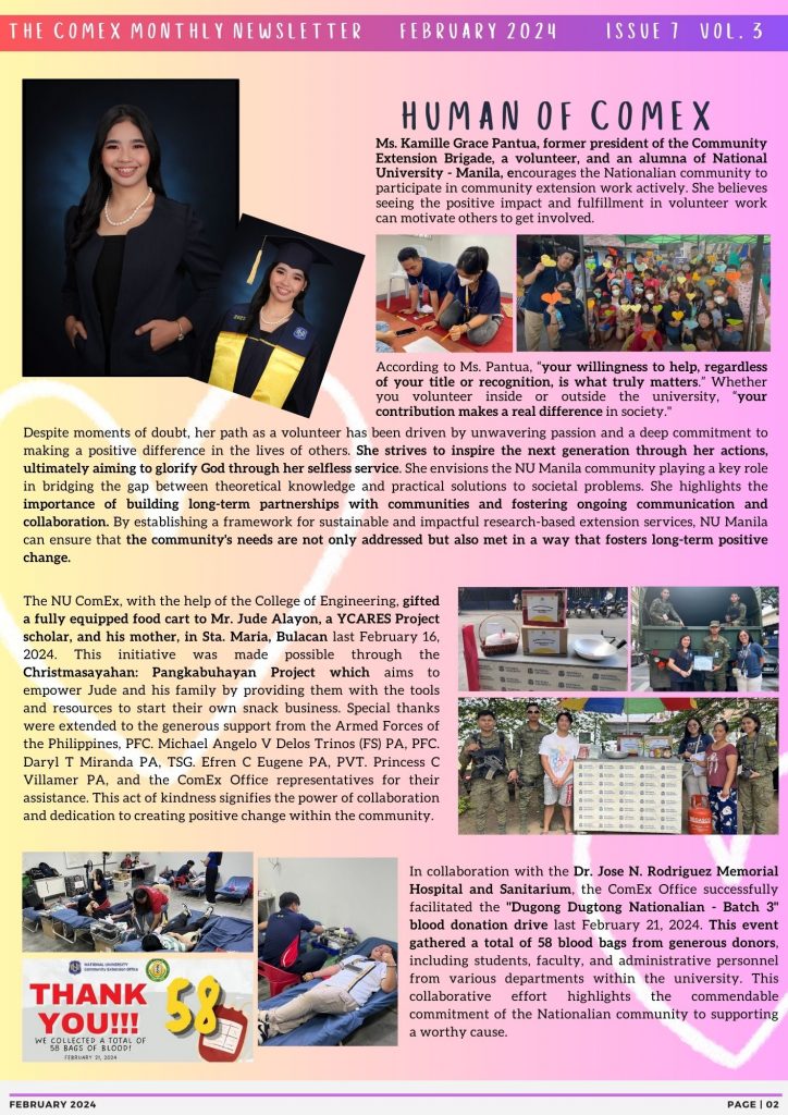 For the seventh issue featuring this month’s Human of ComEx and to celebrate the Love Month, we highlighted the efforts of our very own NU Alumni and former President of ComEx Brigade, Ms. Kamille Grace Pantua.