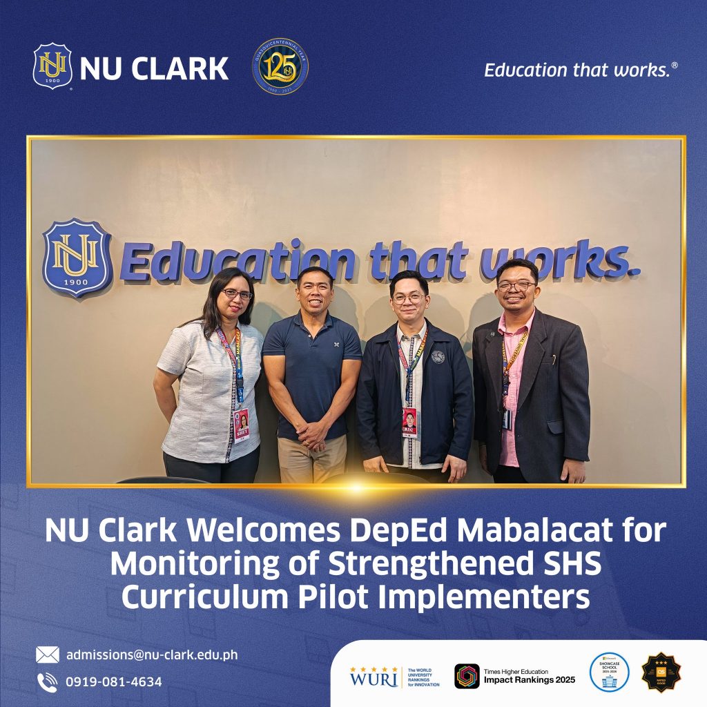 NU Clark proudly welcomed representatives from DepEd SDO Mabalacat City for the Monitoring of the Strengthened Senior High School (SHS) Curriculum Pilot Implementers. This meaningful initiative marks an important step toward ensuring quality and the continuous improvement of senior high school education.
