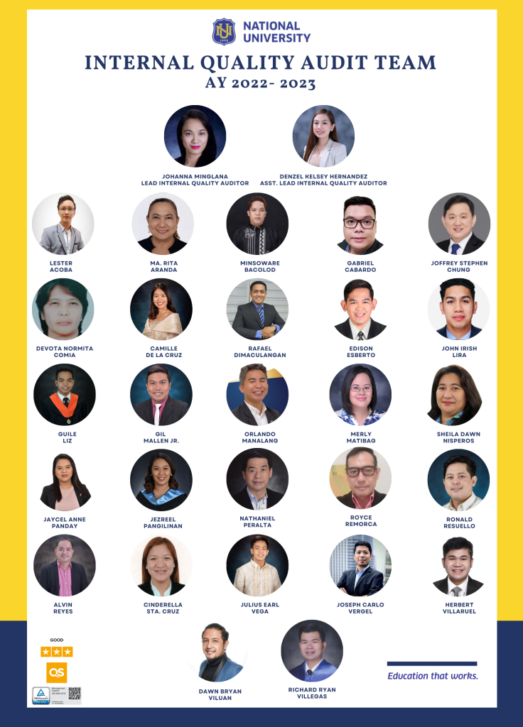 As part of NU’s continuous quality improvement, we are pleased to announce the set of Internal Quality Auditors for AY 2022-2023. They are your partners in ensuring that NU succeeds in its journey towards excellence and remains steadfast in its commitment to provide education that works.