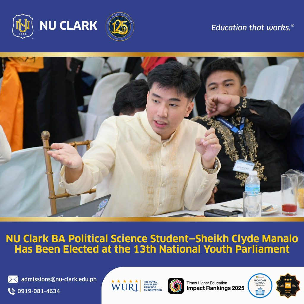 We congratulate NU Clark BA Political Science student Sheikh Clyde Manalo on his election at the 13th National Youth Parliament – National Assembly!