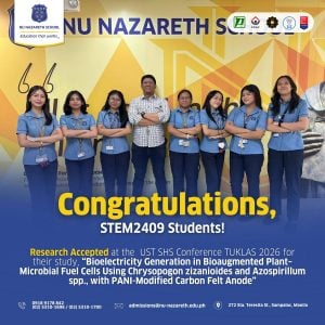 NU Nazareth School continues to uphold its commitment to academic excellence as its Senior High School STEM 2409 students earn acceptance to present their research at the UST SHS Conference, TUKLAS 2026: Lighting the Future Through Research and Multidisciplinary Collaboration, happening on April 27–29, 2026. Two research groups from the STEM 2409 section will represent the school, showcasing innovative and sustainability‑driven studies that explore alternative energy solutions through microbial fuel cell technology. Among the accepted studies is “Cocos nucifera Electrodes […]