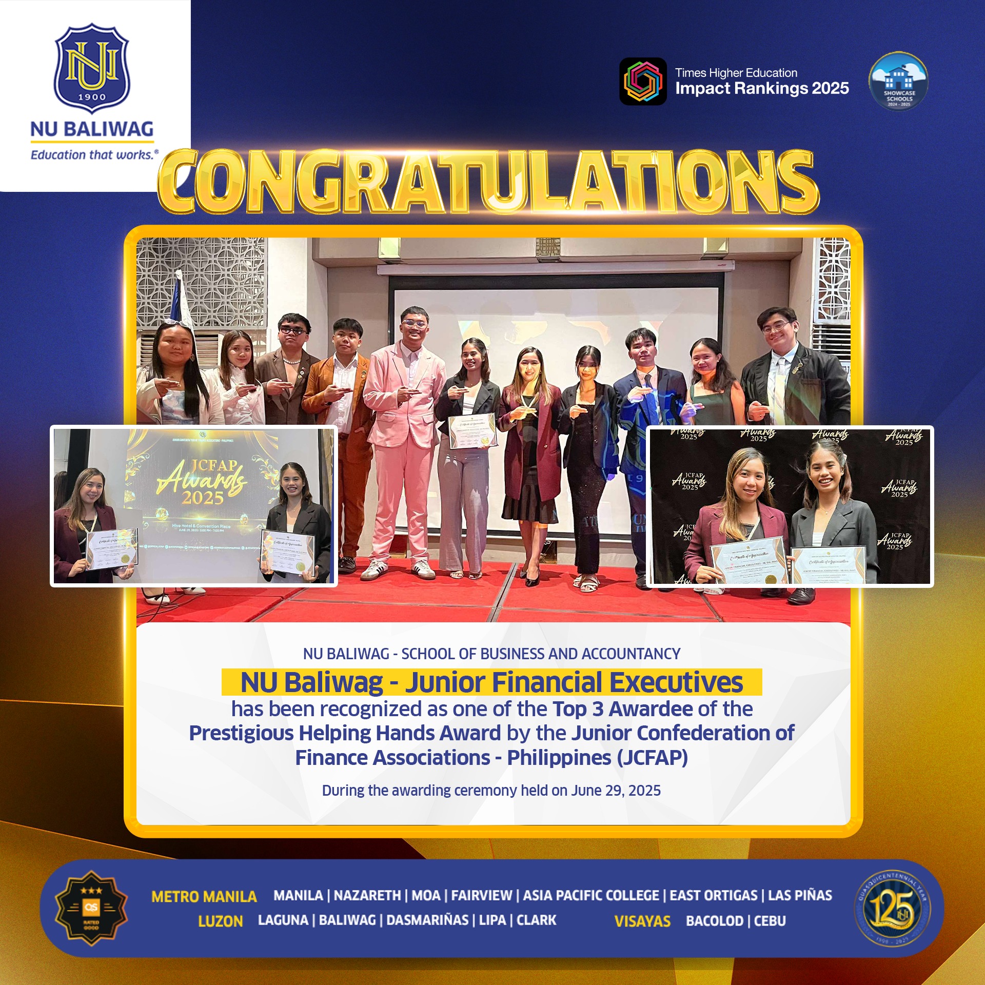 NU Baliwag continues to make its mark on the national stage as the Junior Financial Executives (JFINEX) has been named one of the Top 3 awardees of the esteemed Helping Hands Award by the Junior Confederation of Finance Associations – Philippines (JCFAP).