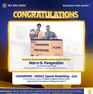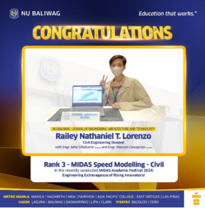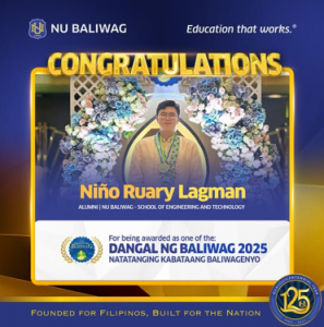 - Alumni Recognition: Niño Ruary Lagman, NU Baliwag alumnus of the School of Engineering and Technology, awarded 𝗗𝗮𝗻𝗴𝗮𝗹 𝗻𝗴 𝗕𝗮𝗹𝗶𝘄𝗮𝗴 𝟮𝟬𝟮𝟱 – 𝗡𝗮𝘁𝗮𝘁𝗮𝗻𝗴𝗶𝗻𝗴 𝗞𝗮𝗯𝗮𝘁𝗮𝗮𝗻𝗴 𝗕𝗮𝗹𝗶𝘄𝗮𝗴𝗲𝗻𝘆𝗼.