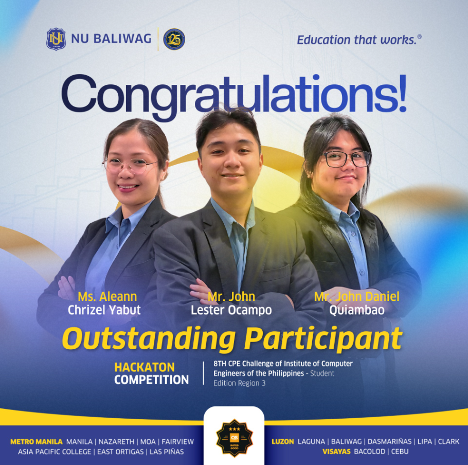 NU Baliwag proudly celebrates another remarkable achievement as its outstanding Nationalians from the Department of Computer Engineering secured 4th Place in the highly competitive Robothon Competition at the 8th CpE Challenge of the Institute of Computer Engineers of the Philippines – Student Edition, Region III.