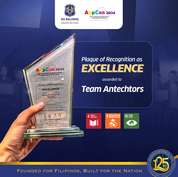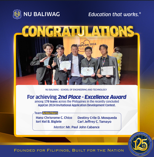 NU Baliwag proudly celebrates the remarkable achievement of our Information Technology students from the School of Engineering and Technology for securing 2nd Place in AppCon 2024: An Innovational Application Development Contest, held on June 28, 2025, at the Adamson Theatre, Manila.