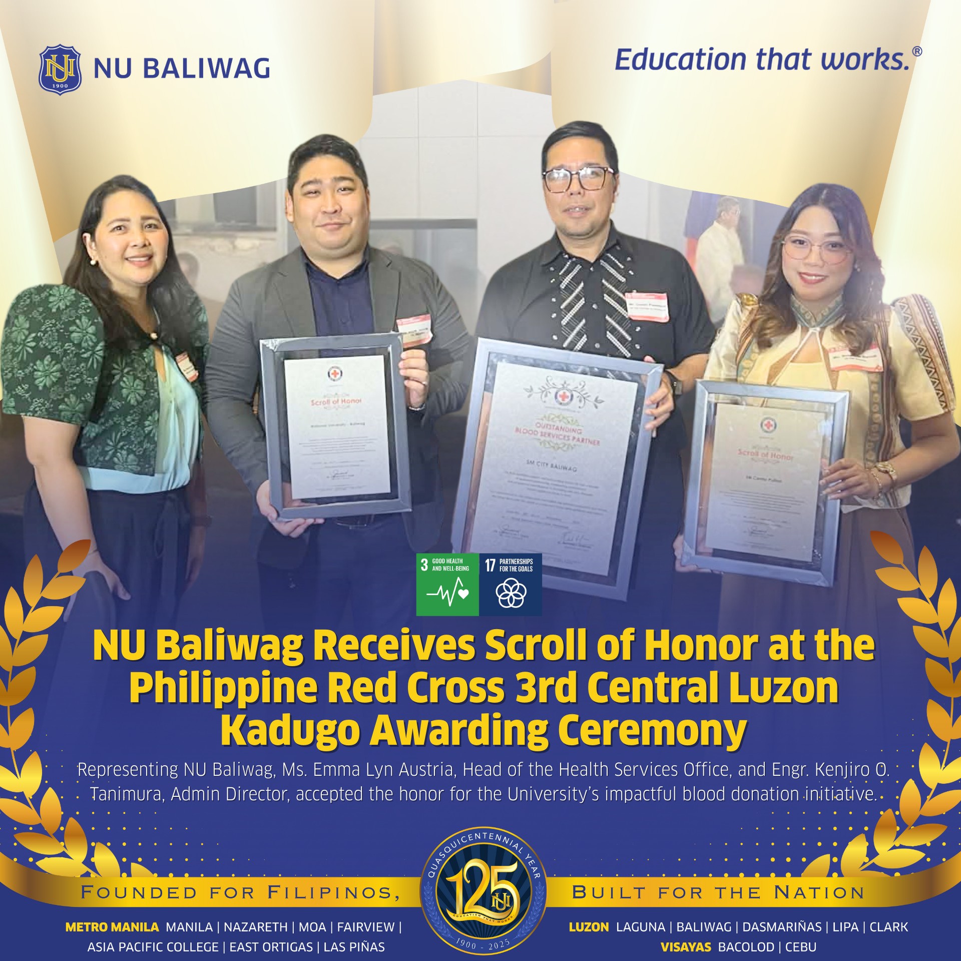 NU Baliwag Receives Scroll of Honor at the Philippine Red Cross 3rd Central Luzon Kadugo Awarding Ceremony