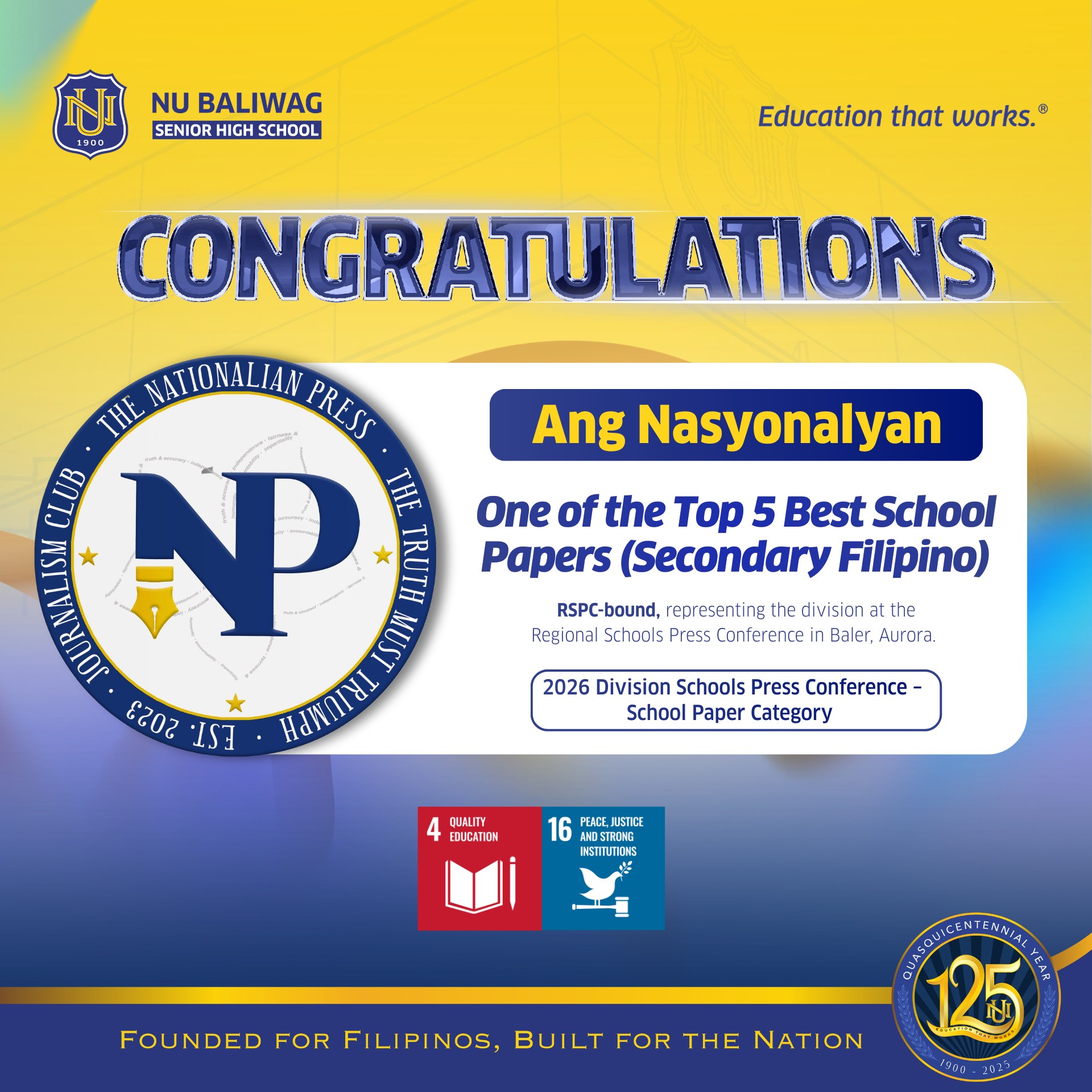 NU Baliwag shines once again as Ang Nasyonalyan, the official school publication of the Senior High School Department, secured a spot among the Top 5 Best School Papers (Secondary – Filipino) during the 2026 Division Schools Press Conference (DSPC).