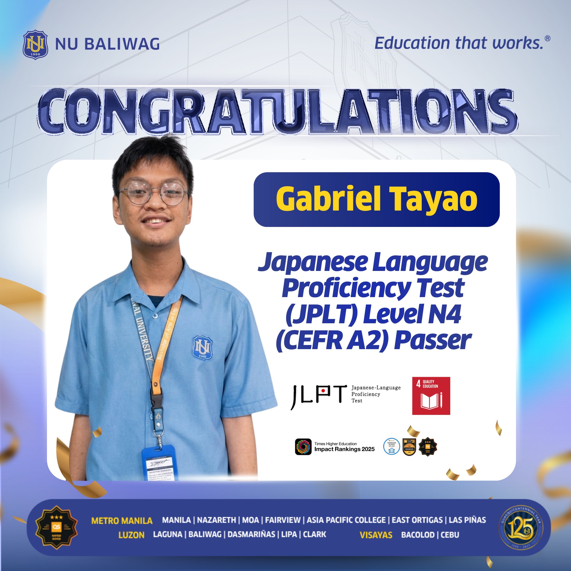 NU Baliwag proudly celebrates the remarkable achievement of Gabriel Tayao, a 2nd Year AB English Language student, for successfully passing the Japanese Language Proficiency Test (JLPT) Level N4, CEFR A2, in December 2025.