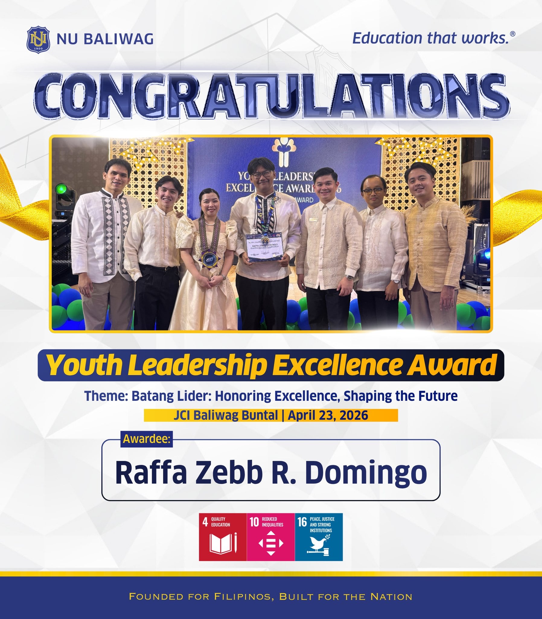 NU Baliwag Senior High School proudly celebrates another milestone as Raffa Zebb R. Domingo, President of the National HUMSS Society, earns recognition at the Youth Leadership Excellence Award 2026. Embodying the spirit of “Batang Lider, Bandera ng Kinabukasan,” Raffa’s achievement highlights the power of purpose-driven leadership, strong mentorship, and a commitment to meaningful impact.