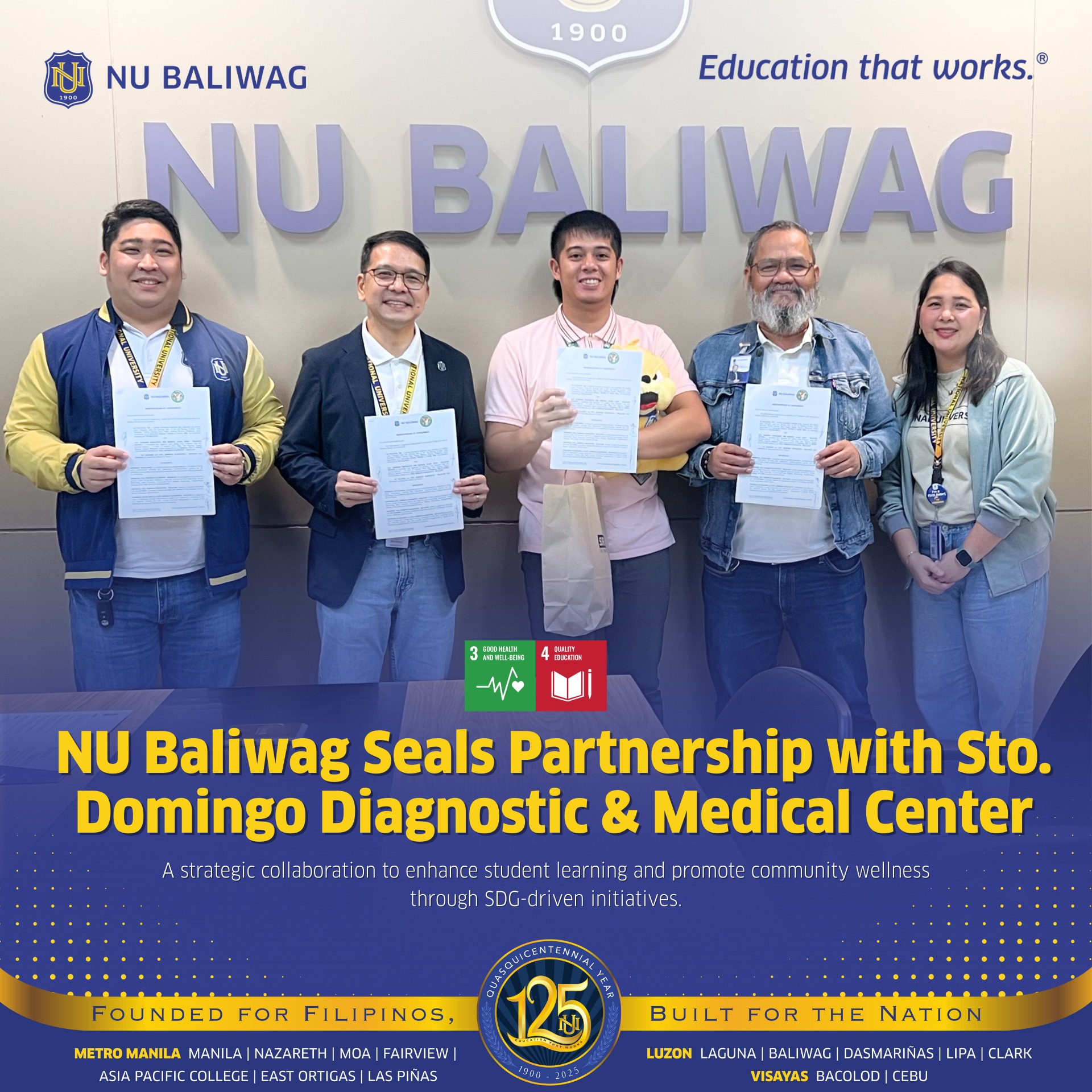 NU Baliwag proudly announces its newly established partnership with Sto. Domingo Diagnostic & Medical Center, a collaboration aimed at enriching student learning experiences and promoting community wellness through initiatives aligned with the Sustainable Development Goals (SDGs). 💛💙