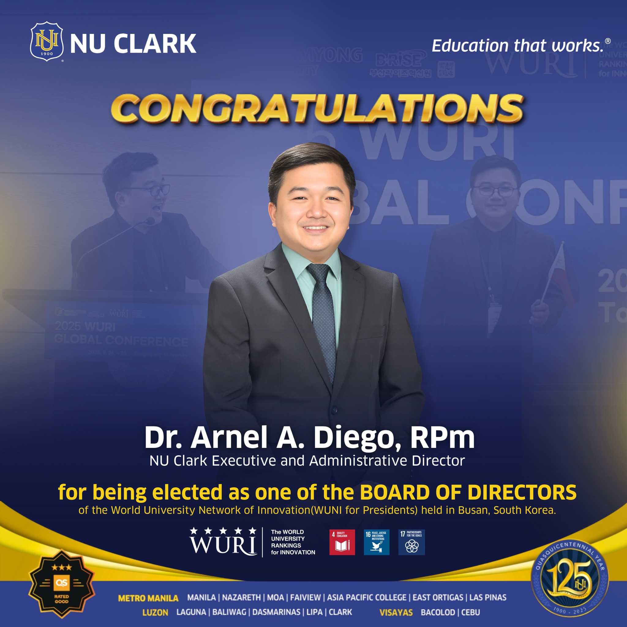 NU Clark proudly congratulates Dr. Arnel A. Diego, for his appointment as one of the Board of Directors of the World University Network of Innovation (WUNI) during its recent gathering in Busan, South Korea.