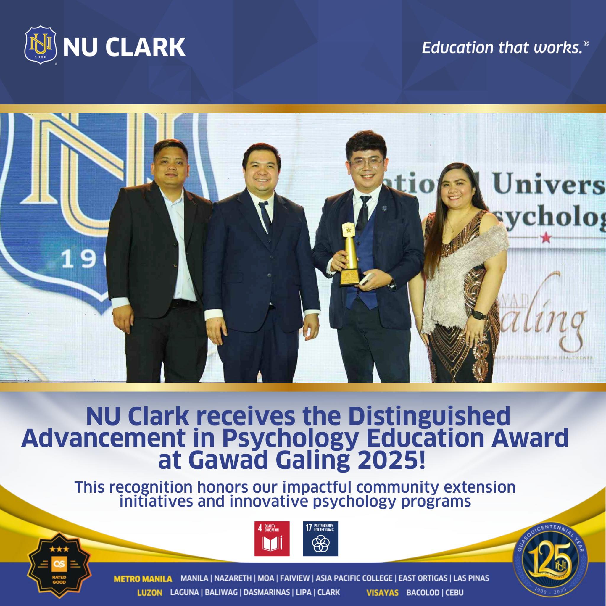 The Department of Psychology of National University Clark was honored with the Distinguished Advancement in Psychology Education Award during the Gawad Galing 2025 ceremony held at City of Dreams, Pasay City, Metro Manila.