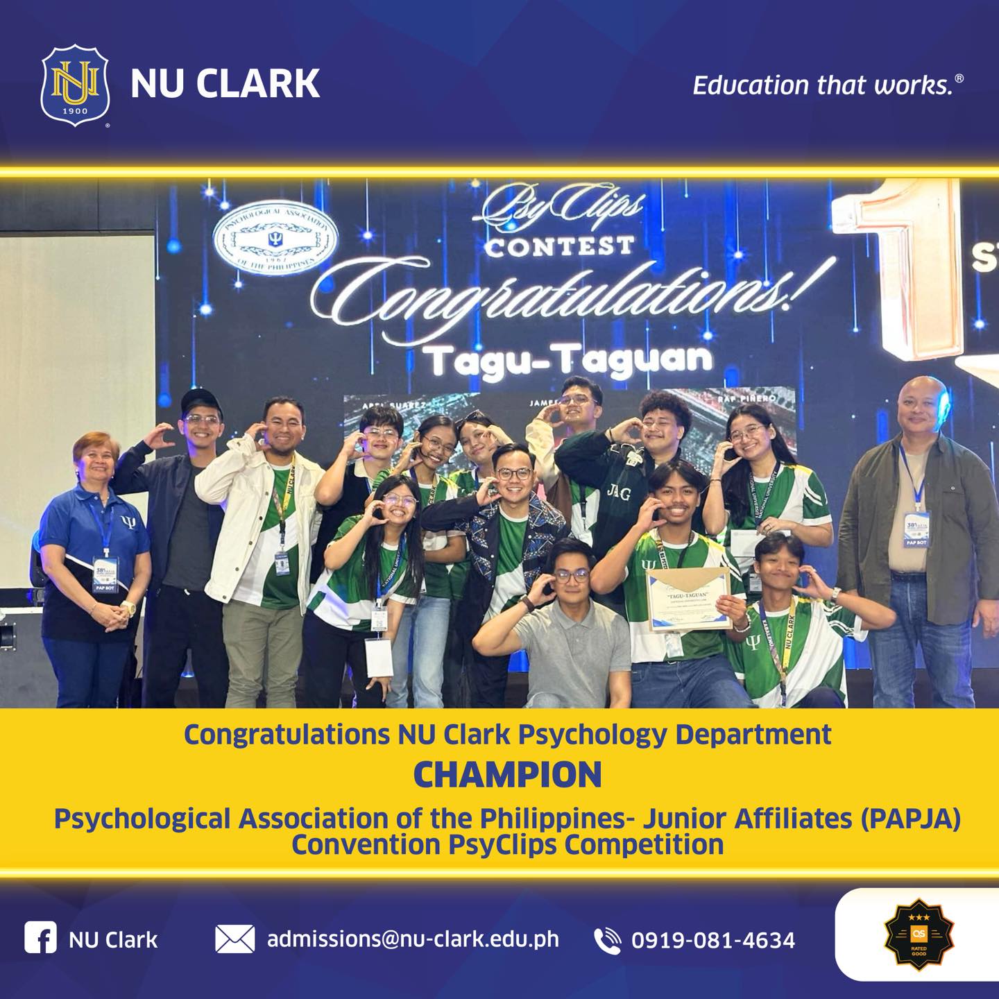 👏 Congratulations to our winning team for bringing pride and honor to NU Clark! Your achievement reflects the university’s commitment to fostering not just academic learning, but also creative expression, critical thinking, and leadership in the field of psychology.