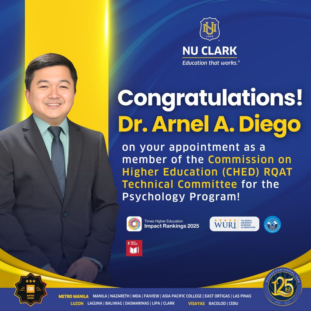 #NUClarkPrideΒ NU Clark proudly congratulates Dr. Arnel A. Diego on his appointment as a member of the Commission on Higher Education (CHED) Regional Quality Assessment Team (RQAT) Technical Committee for the Psychology Program.