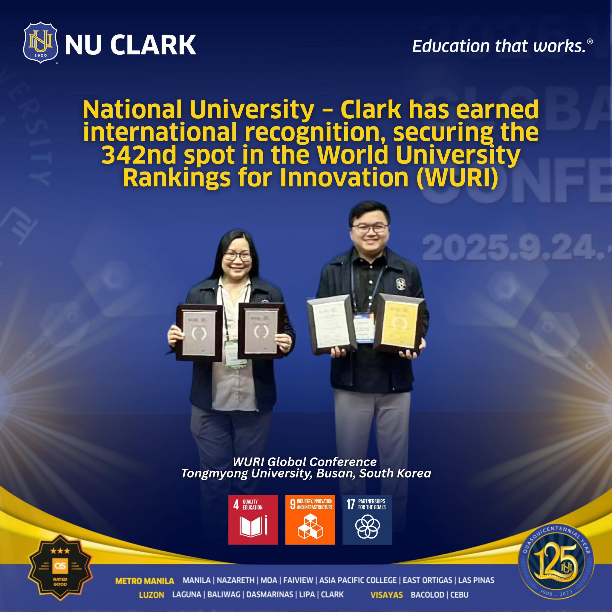 NU Clark has earned global recognition, placing 342nd in the 2025 World University Rankings for Innovation (WURI)βa prestigious list showcasing the Most Innovative Universities in the World.