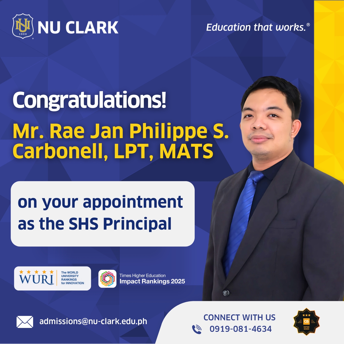 NU Clark proudly welcomes Principal Rae Jan Carbonell, a Licensed Professional Teacher with over 13 years of experience in the academe. He brings with him a strong background in both classroom instruction and academic leadership.