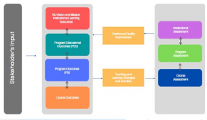 OBE is an educational technique that aims to accomplish specific learning outcomes for students. The Outcomes-Based Education (OBE) framework shown in the figure will be used the Department of Computer Engineering (CpE) at National University – Dasmariñas. The framework indicates that the administration will consider comments from stakeholders (internal and external) and accreditors (internal and external) in order to improve quality (CQI) of program delivery.