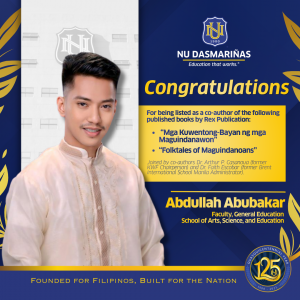 NU Dasmariñas proudly extends its warmest congratulations to Mr. Abdullah Abubakar for his remarkable contribution to the preservation of Philippine cultural heritage through literature. He is one of the co-authors of the books “Mga Kuwentong-Bayan ng mga Maguindanawon” and “Folktales of Maguindanoans,” published by Rex Education.