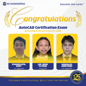 NU Dasmariñas proudly congratulates Kent S. Evangelista and John Paul V. Gonzales of Civil Engineering, and Irish Yi-Fung M. Lee of Architecture for achieving a perfect score of 1000 in the Autodesk Certified User: AutoCAD Certification Exam.