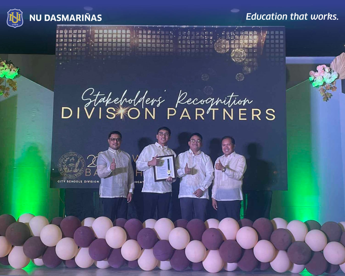 The NU Dasmariñas thru its offices of Academe-Industry Linkages Placement and Community Extension was awarded as the top School Stakeholder of Edilberto S. Legaspi Integrated High School and one of the top Division Stakeholders DepEd Tayo Dasmariñas City during the 2023 Gawad Bayanihan- City Schools Division of Dasmariñas’ Education Summit