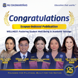 NU Dasmariñas proudly highlights a significant academic milestone as the study “WELLNEST: Fostering Student Well-Being in Academic Settings” has been recognized as a Scopus-indexed research publication, underscoring its contribution to innovation, research excellence, and academic impact.