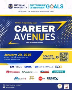 Network, Explore, and Unlock New Career Opportunities! The National University Academic Internship and Placement Office (AIPO) is thrilled to invite you to the Career AveNUes: Internship and Job Fair on January 29, 2026, from 9AM to 3PM at NU Manila, Multipurpose Hall,12th Floor, Annex I Building. Connect with top employers and leading industry partners like BDO, SM Supermalls, China Banking Corporation, Watsons, Alfamart, and more. Whether you’re looking for an internship or stepping into the professional world, this is your […]