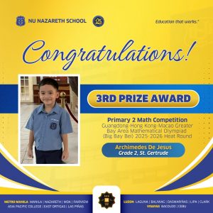 November 23, 2025 – Online (ExamOnline Platform) NU Nazareth School is pleased to share that one of its Grade School students successfully participated in the Guangdong-Hong Kong-Macao Greater Bay Area Mathematical Olympiad (Big Bay Bei) 2025–2026 Heat Round, conducted via the ExamOnline platform on November 23, 2025. The competition brought together young mathematics enthusiasts to demonstrate their problem-solving skills in a highly competitive international setting. Representing the NU Nazareth School, Archimedes De Jesus, a Grade 2 student, earned the 3rd […]