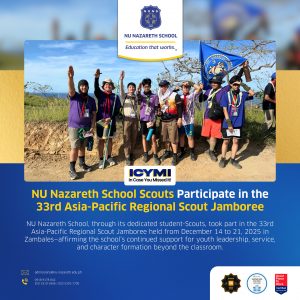 NU Nazareth School proudly took part in the 33rd Asia-Pacific Regional Scout Jamboree, held from December 14 to 21, 2025, at Camp Kainomayan, Botolan, Zambales, Philippines. The international event gathered thousands of Scouts from across the Asia-Pacific region under the theme “Be Prepared: Scouts for Peace and Sustainable Development.” According to reports from Inquirer.net, more than 23,000 Scouts, leaders, and volunteers from various countries participated in the jamboree, making it one of the largest Scouting events in the region. The […]