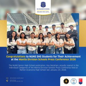 During the Manila Division Schools Press Conference held at Ramon Avancena High School on January 24, 2026, the NUNS Senior High School publication Vox Nazaliani showcased excellence by securing awards in the Individual Categories. Among more than 40 competing schools, our student journalists proved that creativity and credibility shine through every word and line they create. Spearheaded by the school paper adviser, Mr. Bryan Ramirez, MST, together with the SHS SDAO and the coaches, this remarkable achievement reflects the dedication […]