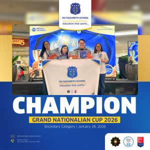 January 28, 2026 – SM City Manila NU Nazareth School proudly emerged as Champion at the Grand Nationalian Cup, a prestigious inter-campus academic quiz bee organized by the National University Junior Philippine Institute of Accountants (NUJPIA). The competition was held at the SM City Manila and brought together top-performing students from various National University campuses. Representing NU Nazareth School with excellence and discipline were Justine Esconde, Erika Lagata, and Alliana Madrigal, who demonstrated strong mastery of accounting and business concepts, […]