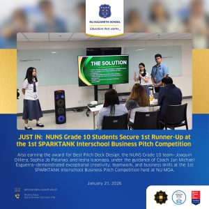 January 21, 2026 – NU MOA, Pasay City NU Nazareth School proudly celebrates the achievement of its Grade 10 students, who placed 1st Runner-Up at the 1st SPARKTANK Interschool Business Pitch Competition, held as part of ABM Week 2026 organized by NU MOA Senior High School. Representing NUNS were Joaquin Dillera, Sophia Jo Patanao, and Iesha Icaonapo, under the guidance of Coach Jun Michael Esguerra. The team impressed the judges with their well-prepared business pitch, creativity, and teamwork. In addition […]