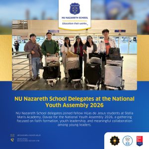 January 29, 2026 – Stella Maris Academy, Davao NU Nazareth School actively participated in the National Youth Assembly 2026, held at Stella Maris Academy in Davao, which gathered student-delegates from various schools under the Hijas de Jesus congregation. The assembly served as a meaningful platform for youth formation, fellowship, and shared faith experiences. Representing NU Nazareth School were Laurence Miguel Candolita, Stephene Dale Coloma, Jonikka Duyan, Sophia Jo Patanao, and Loreign Ferrer, accompanied by Mr. Arnold Baloso, Coordinator of the […]
