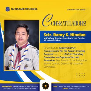 NU Nazareth School proudly shares that Sctr. Ramy G. Hinolan, the school’s Institutional Scouting Coordinator and faculty member, has been re-elected to key leadership positions in the Boy Scouts of the Philippines (BSP) Manila Council, District 4B Scouting Committee, affirming the continued trust placed in his leadership and service to the scouting movement. Sctr. Hinolan was re-elected as Deputy District Commissioner for the Senior Scouting Program and as a member of the District Standing Committee on Organization and Extension. These […]