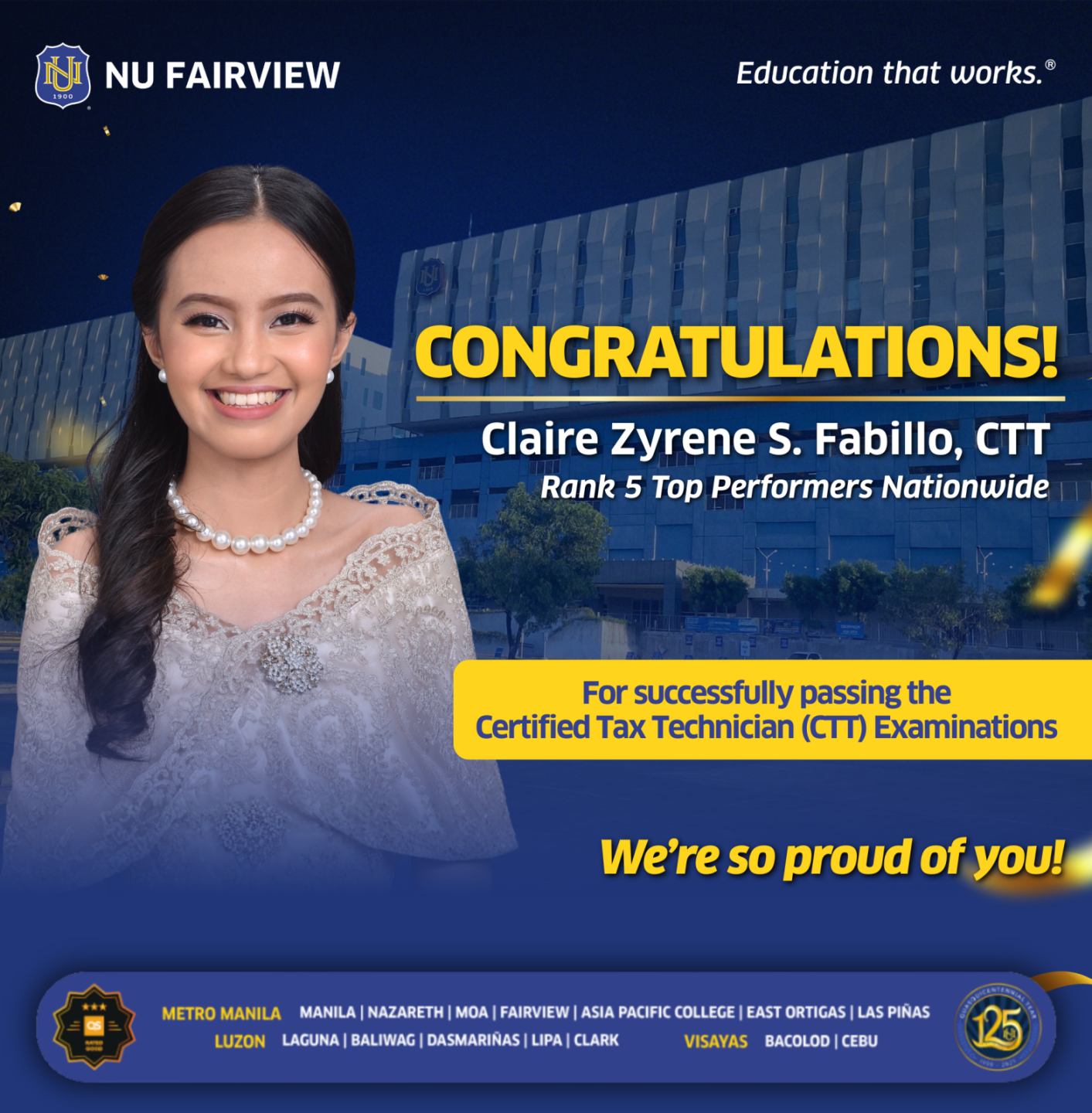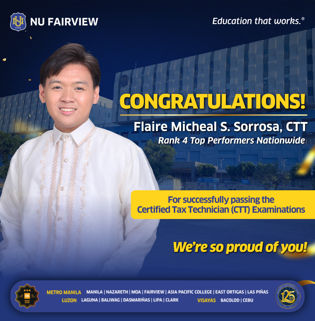 Your achievements bring pride and inspiration to the entire NU Fairview community. May you continue to excel and make a meaningful impact in the field of taxation and public service.