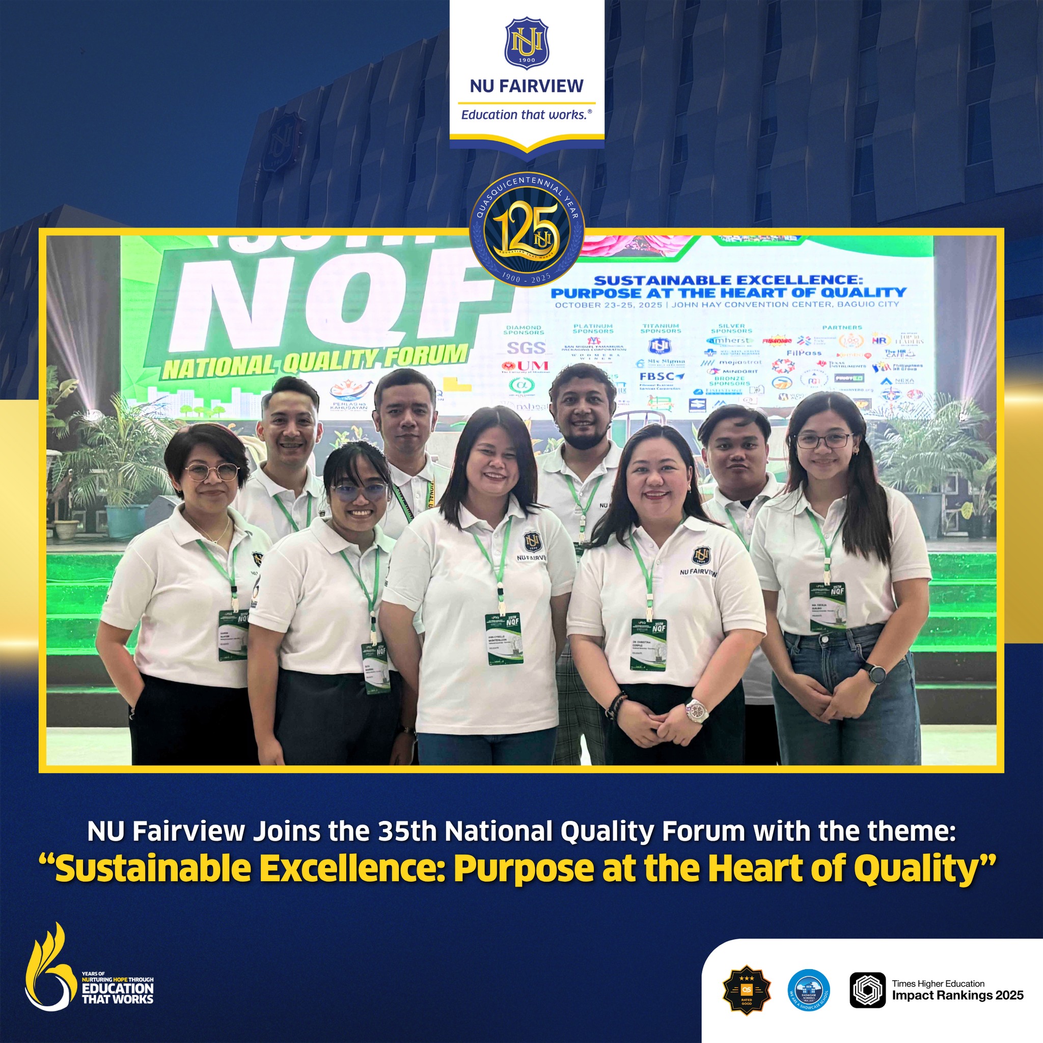 On October 23, the NU Fairview Quality Management Office, together with the Executive Director Dr. Christina R. Corpuz, selected QAT Representatives, and staff joined the 35th National Quality Forum with the theme “Sustainable Excellence: Purpose at the Heart of Quality,” hosted by the Philippine Society for Quality.