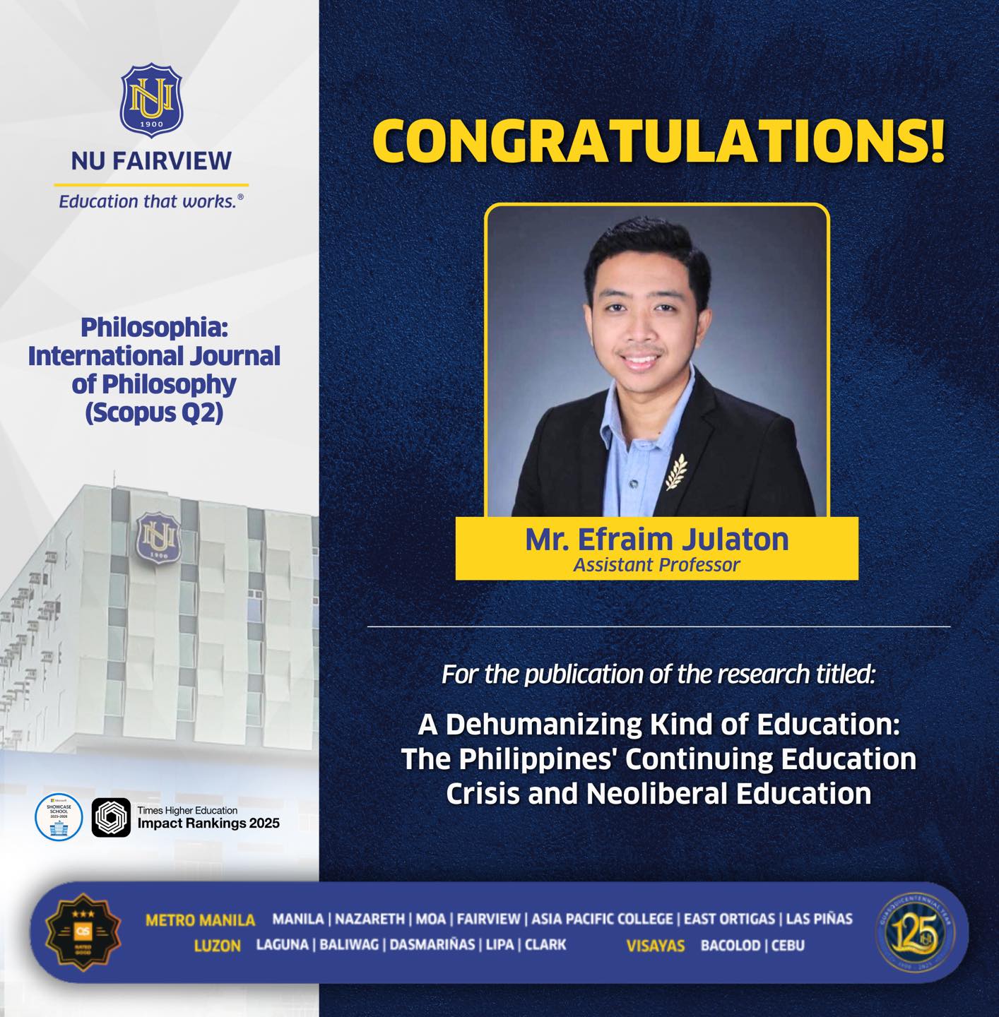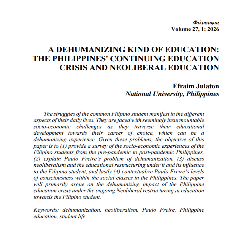 Congratulations to our SAS faculty, Mr. Efraim Julaton, on the publication of his article, “A Dehumanizing Kind of Education: The Philippines’ Continuing Education Crisis and Neoliberal Education,” featured in the January 2026 issue of Philosophia: International Journal of Philosophy (Scopus Q2).