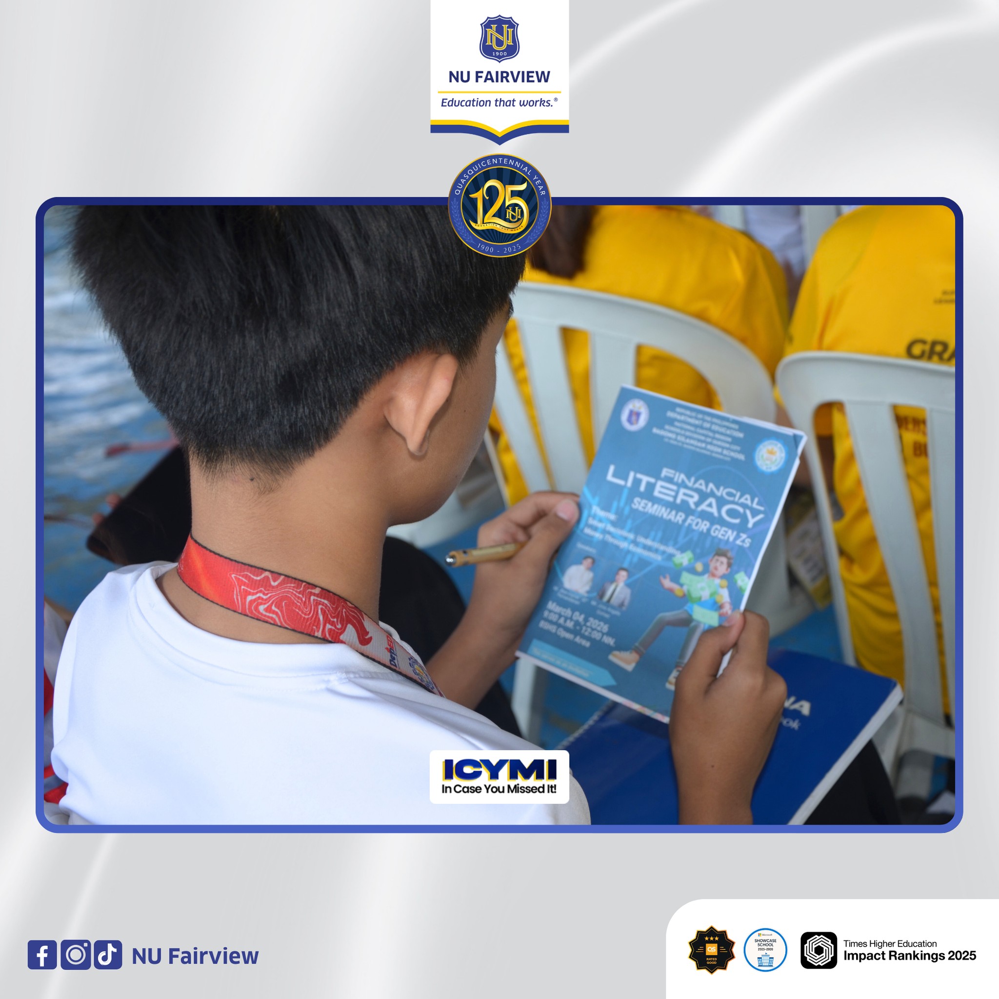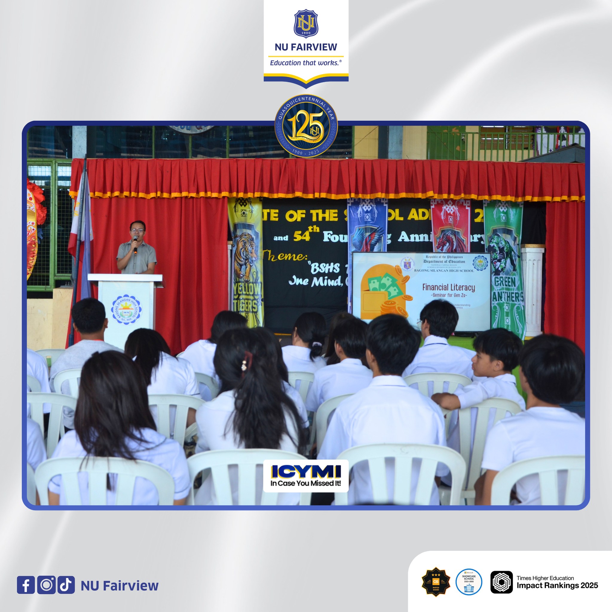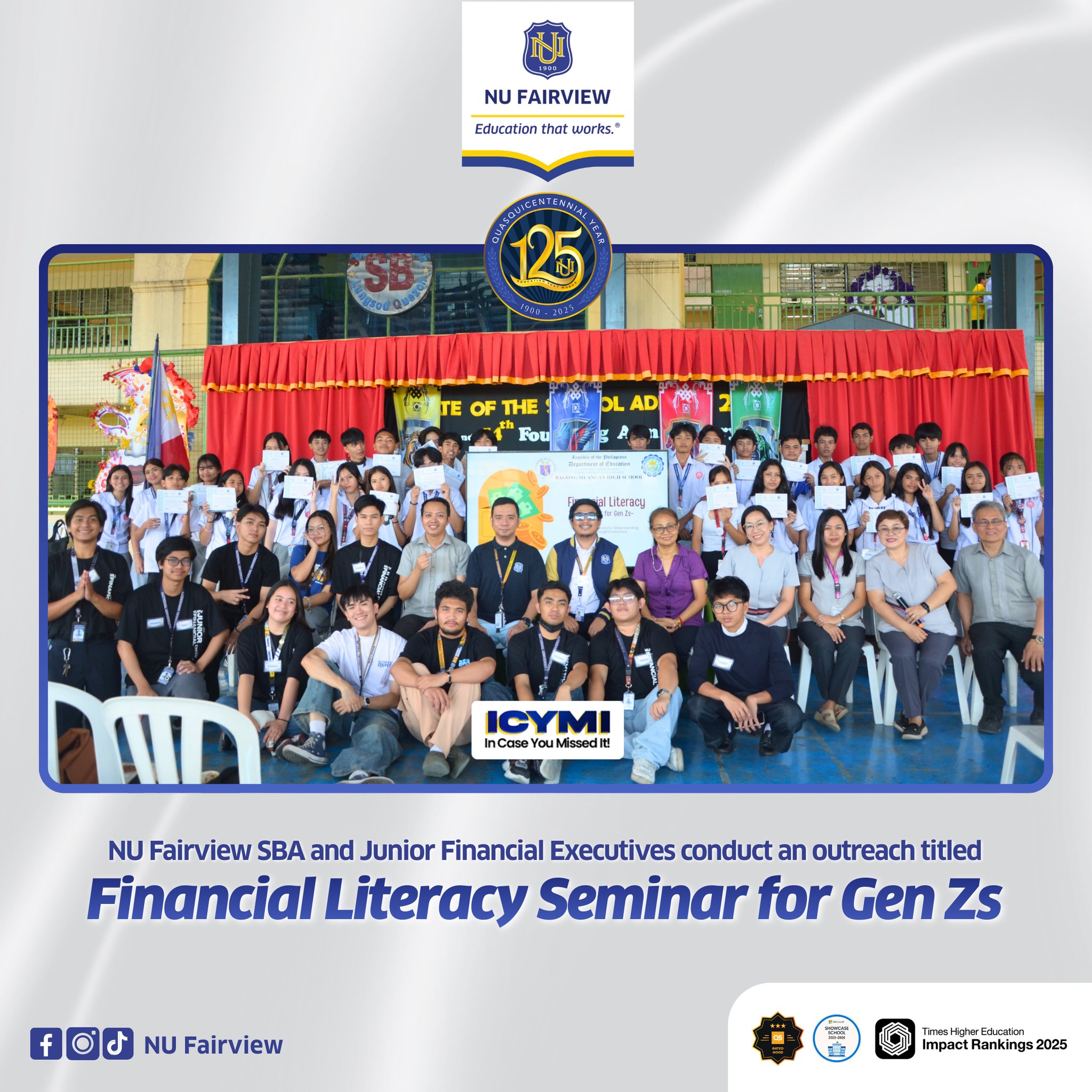 On March 4, 2026, the NU Fairview Junior Financial Executives, under the School of Business and Accountancy, conducted an outreach initiative titled “Financial Literacy Seminar for Gen Zs” at Bagong Silangan High School. This activity forms part of the organization’s continuing commitment to promoting financial awareness and responsible economic decision-making among Filipino youth.
