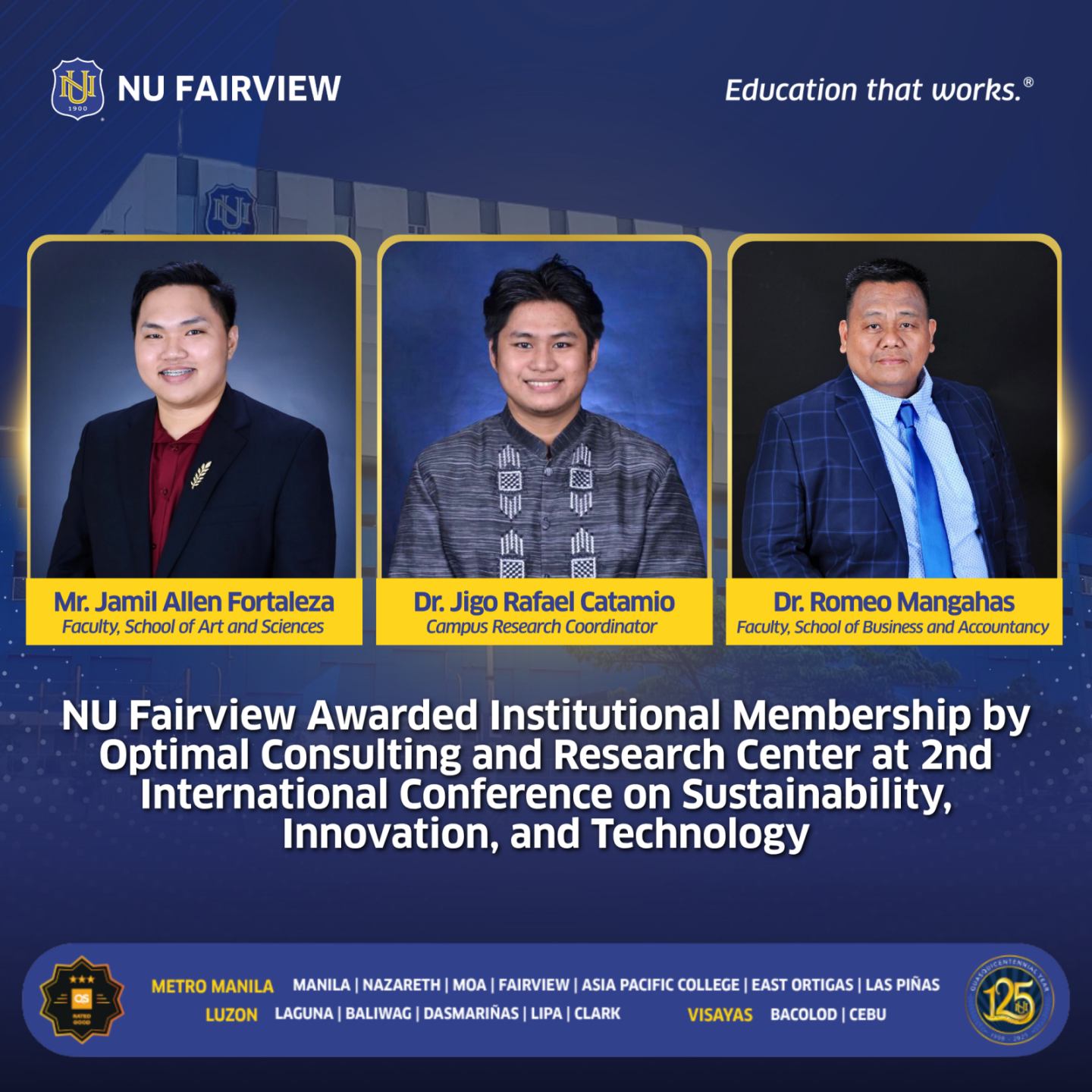 NU Fairview was recently awarded an Institutional Membership of the Optimal Consulting and Research Center in the previously held 2nd International Conference on Sustainability, Innovation and Technology (ICSIT 2025), last June 19-21, 2025.