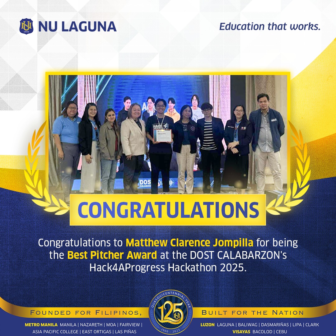 NU Laguna proudly congratulates Matthew Clarence Jompilla for clinching the Best Pitcher Award at the  DOST CALABARZON Hack4AProgress Hackathon 2025. This remarkable achievement highlights student’s innovation, passion, and outstanding ability to communicate their ideas effectively among some of the region’s brightest young minds.