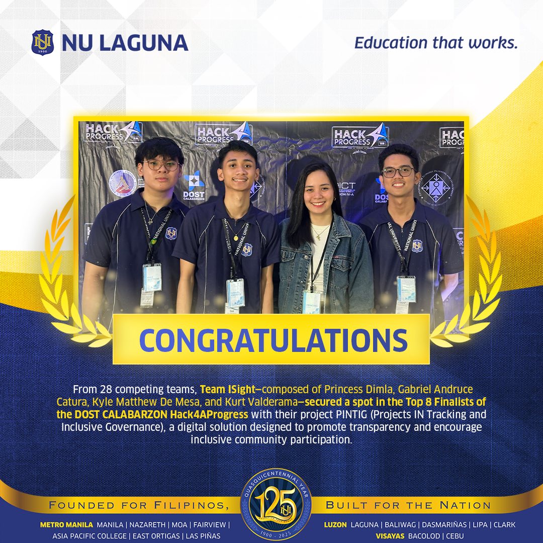 NU Laguna is proud to announce that Team ISight has advanced to the Top 8 Finalists out of 28 competing teams in the prestigious DOST CALABARZON Hack4AProgress Hackathon 2025—a testament to the team’s innovation, collaboration, and commitment to civic-oriented technology.