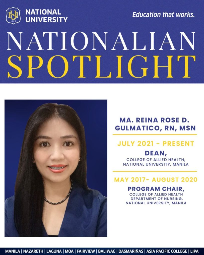 Ma. Reina Rose D. Gulmatico, or Dean Rein to the National University community is the Dean of the College of Allied Health at NU Manila.