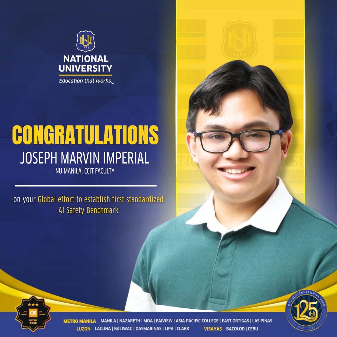Joseph Marvin Imperial, a faculty member of the College of Computing and Information Technologies (CCIT) at the National University (NU) and a researcher at the NU Human Language Technology Lab, has joined forces with MLCommons and international AI experts to develop AILuminateβthe first standardized benchmark for assessing AI model safety and reliability.